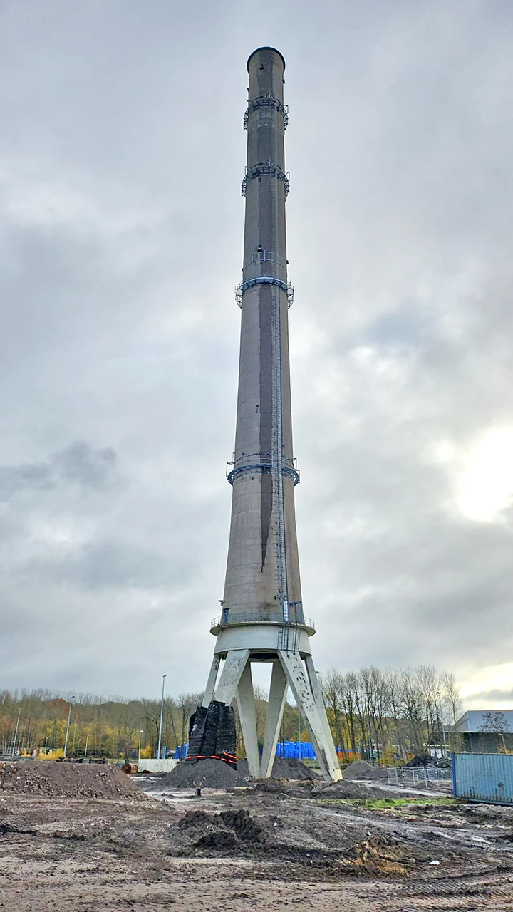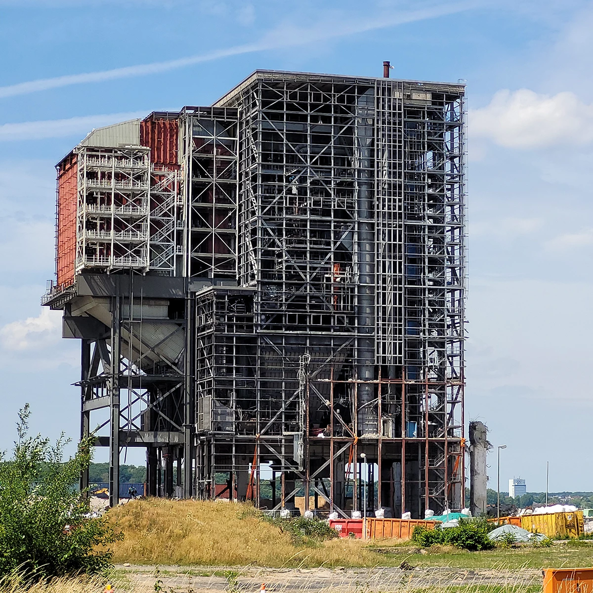 Rückbau des stillgelegten Kohlekraftwerks im Gemeinschaftskraftwerk am Kieler Ostufer. Das Kesselhaus (Stahlkonstruktion, Höhe 63 m) und die DeNoX-Anlage wurden am 12.07.2023 gesprengt und der Schornstein (Höhe 130 m) am 17.11.2023. Das Kohlekraftwerk hat Kiel fast 50 Jahre lang mit Energie versorgt.