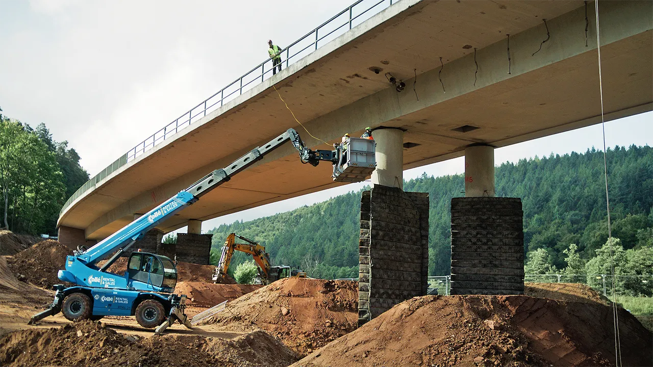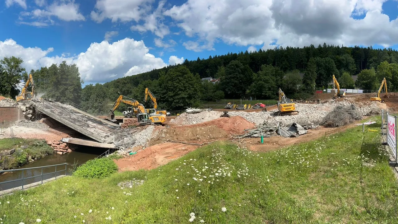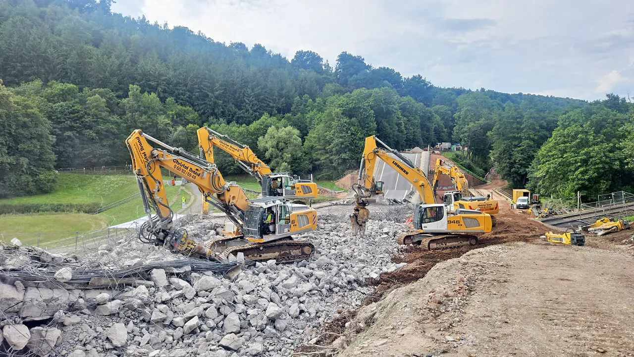 Die Talbrücke bei Bad König/Zell im Odenwaldkreis haben wir am 30.07.2025 gesprengt. Wir waren als Generalunternehmer tätig. Es musste unter anderem eine 80 Tonnen Behelfsbrücke errichtet werden, eine Baustraße mit 150 m Länge und 10.000 m³ und es mussten Schutzmaßnahmen über die Bahngleise sowie über den vorhandenen Bach errichtet werden. Vom Staatsminister Mansoori haben wir aufgrund der hervorragenden Zusammenarbeit ein Dankesschreiben erhalten.