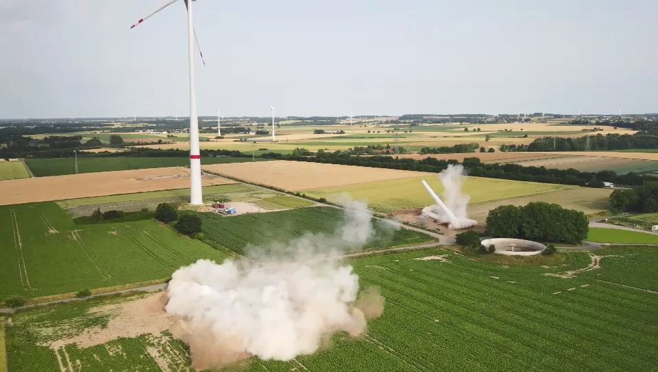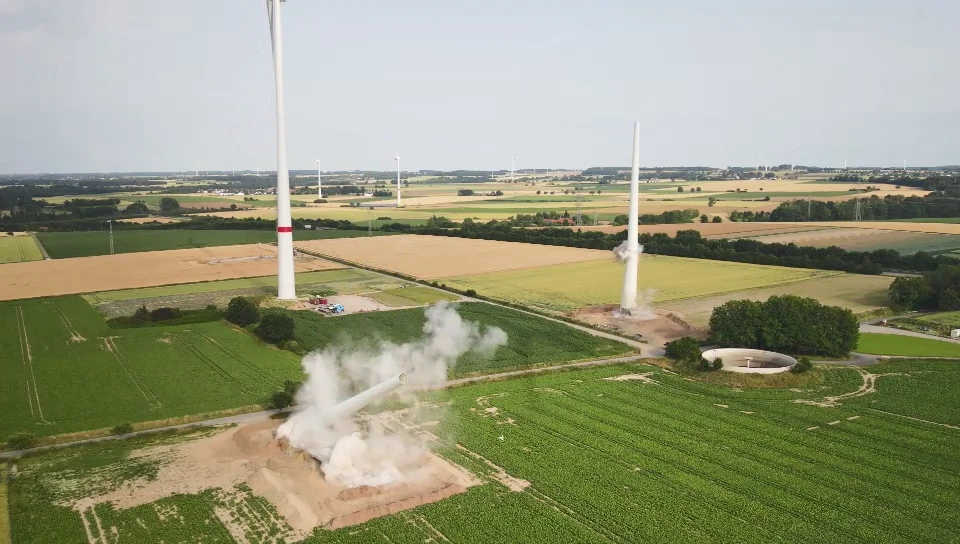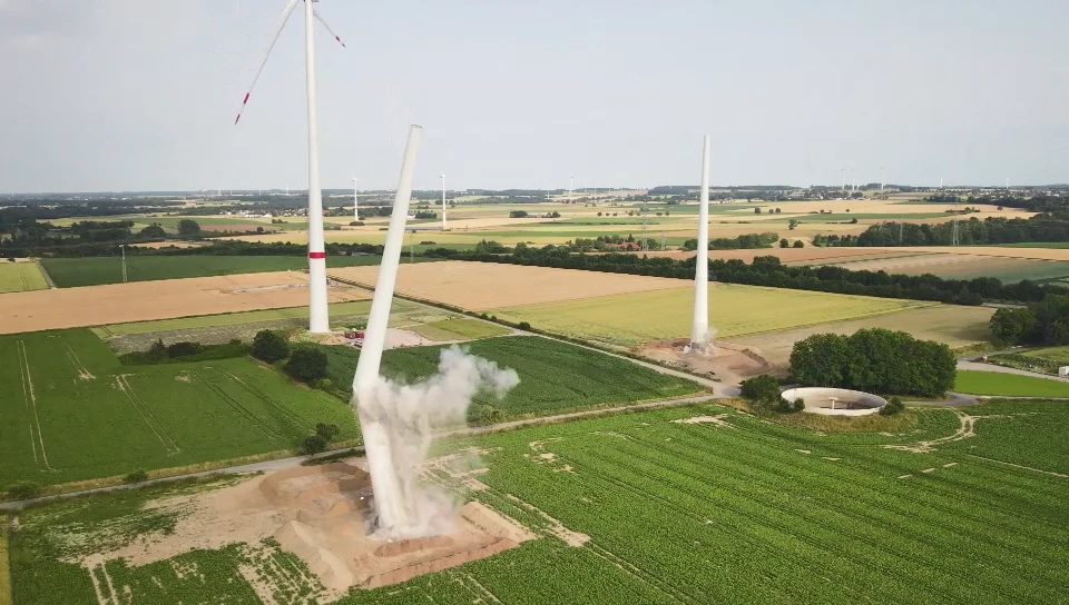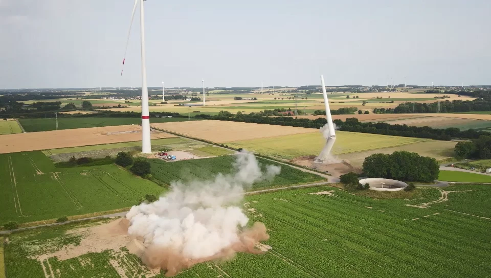 Im Windpark Werl haben wir am 29. Juni 2024 zwei Windkraftanlagen mit einer Faltsprengung kurz hintereinander gesprengt. Die Anlagen hatten eine Nabenhöhe von 98 m.